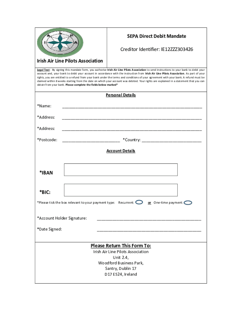 Get the free PDF Irish Air Line Pilots Association SEPA Direct Debit Mandate Creditor ...