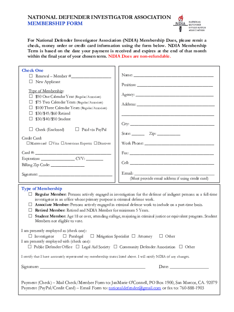 NATIONAL DEFENDER INVESTIGATOR ASSOCIATION MEMBERSHIP FORM For National Defender Investigator Association (INDIA) Membership Dues, please remit a check, money order or credit card information using