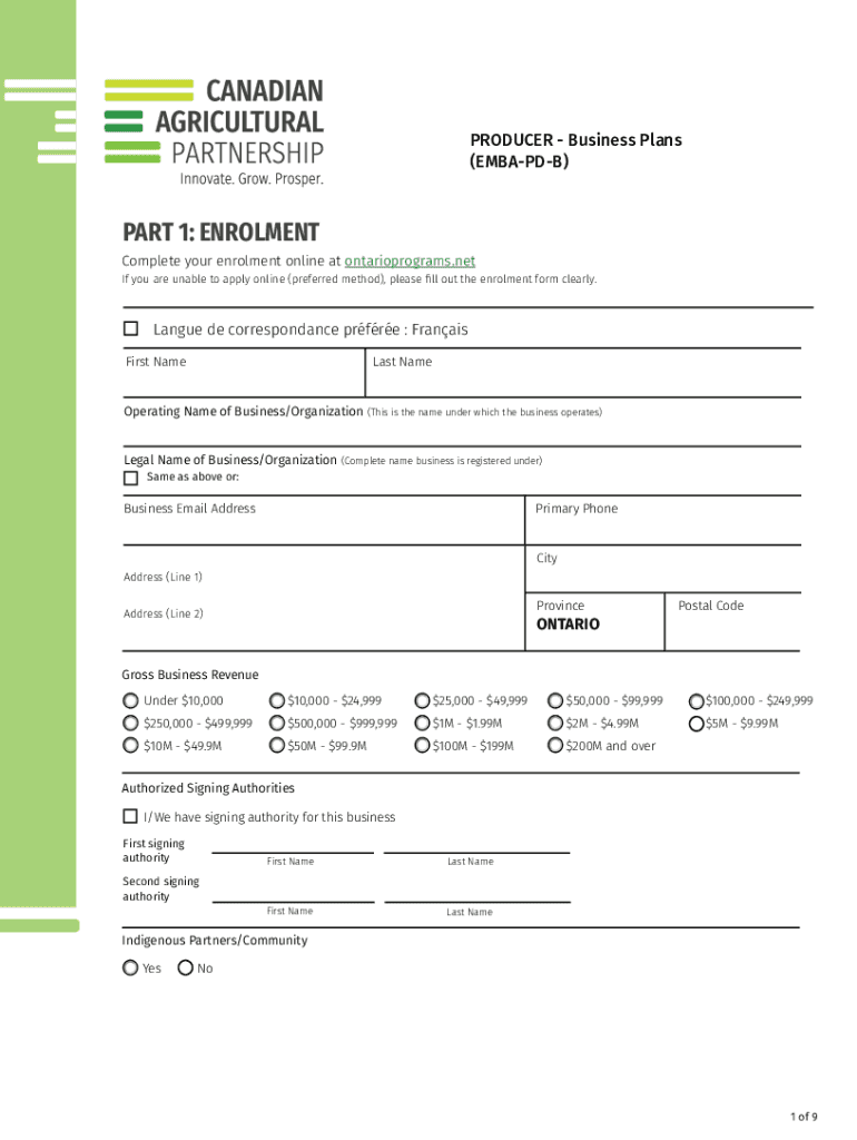 PRODUCER Business Plans (EMBASSY)PART 1: Enrollment Complete your enrollment online at ontarioprograms.net If you are unable to apply online (preferred method), please fill out the enrollment form