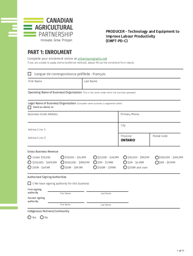 PRODUCER Technology and Equipment to Improve Labor Productivity (EMPTY)PART 1: Enrollment Complete your enrollment online at ontarioprograms.net If you are unable to apply online (preferred method),