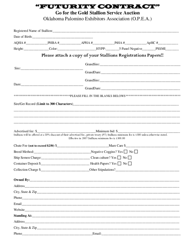 FUTURITY CONTRACT Go for the Gold Stallion Service Auction Oklahoma Palomino Exhibitors Association (O.P.E.A.) Registered Name of Stallion: Date of Birth: AQUA # PBA # ALPHA # PTH # APC # Height: