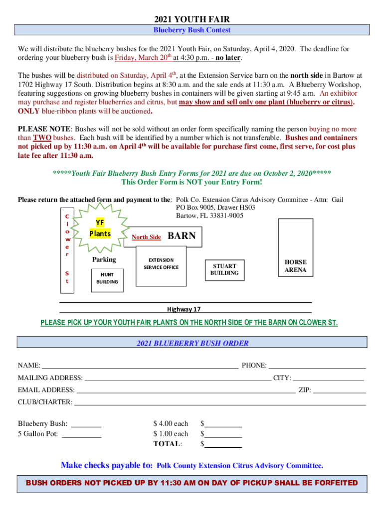 2021 YOUTH FAIR Blueberry Bush Contest We will distribute the blueberry bushes for the 2021 Youth Fair, on Saturday, April 4, 2020. The deadline for ordering your blueberry bush is Friday, March 20th