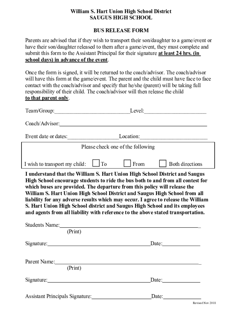 Get the free Bus Release Form - William S. Hart Union High School District ...