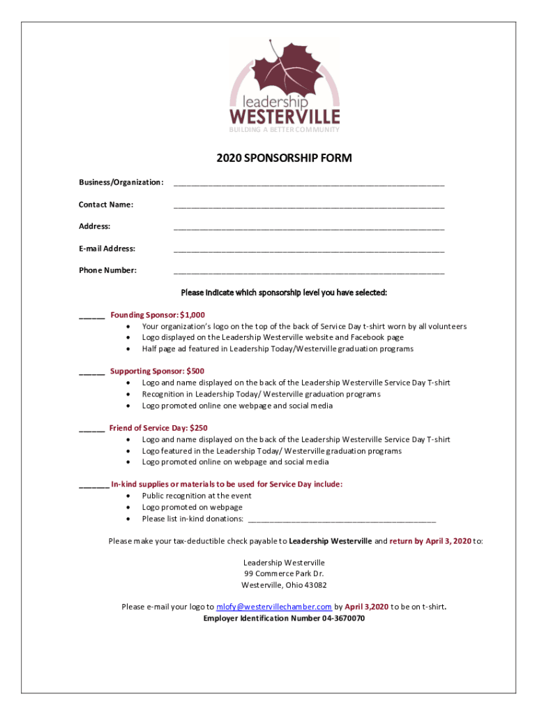 BUILDING A BETTER COMMUNITY2020 SPONSORSHIP FORM Business/Organization: Contact Name: Address: Email Address: Phone Number: Please indicate which sponsorship level you have selected: Founding Sponsor: