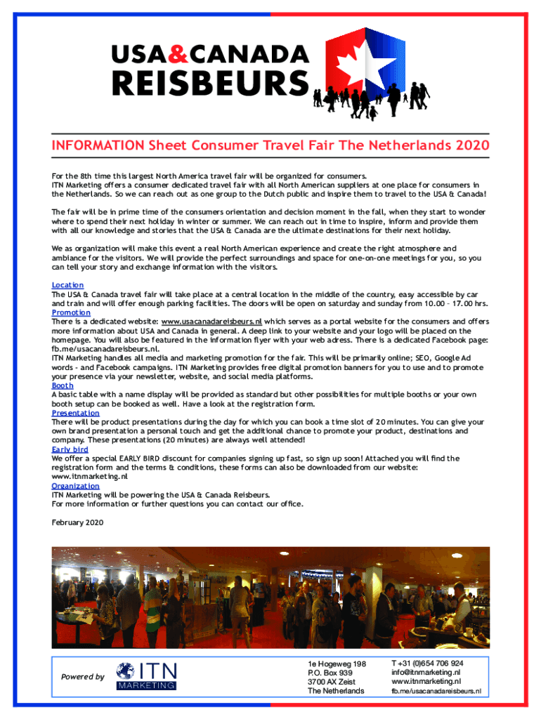 INFORMATION Sheet Consumer Travel Fair The Netherlands 2020 For the 8th time this largest North America travel fair will be organized for consumers. ITN Marketing offers a consumer dedicated travel