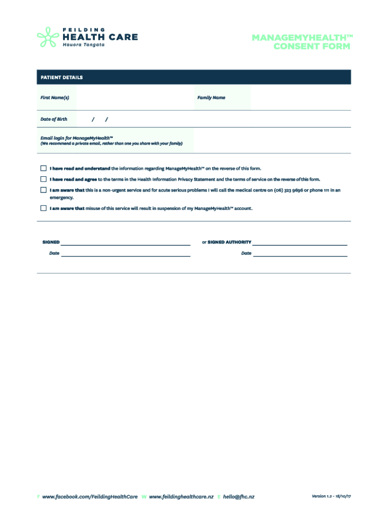 PATIENT DETAILSFirst Name(s)Date of BirthFamily Name//Email login for ManageMyHealth(We recommend a private email, rather than one you share with your family)I have read and understand the information