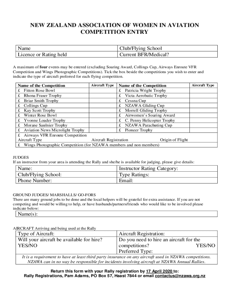 NEW ZEALAND ASSOCIATION OF WOMEN IN AVIATION COMPETITION ENTRY Name License or Rating heldClub/Flying School Current BFR/Medical? A maximum of four events may be entered (excluding Soaring Award,