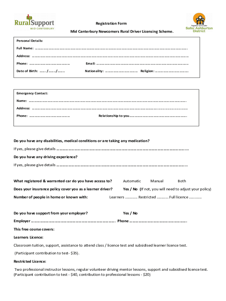 Registration Form Mid-Canterbury Newcomers Rural Driver Licensing Scheme. Personal Details: Full Name:. Address: Phone: Email: