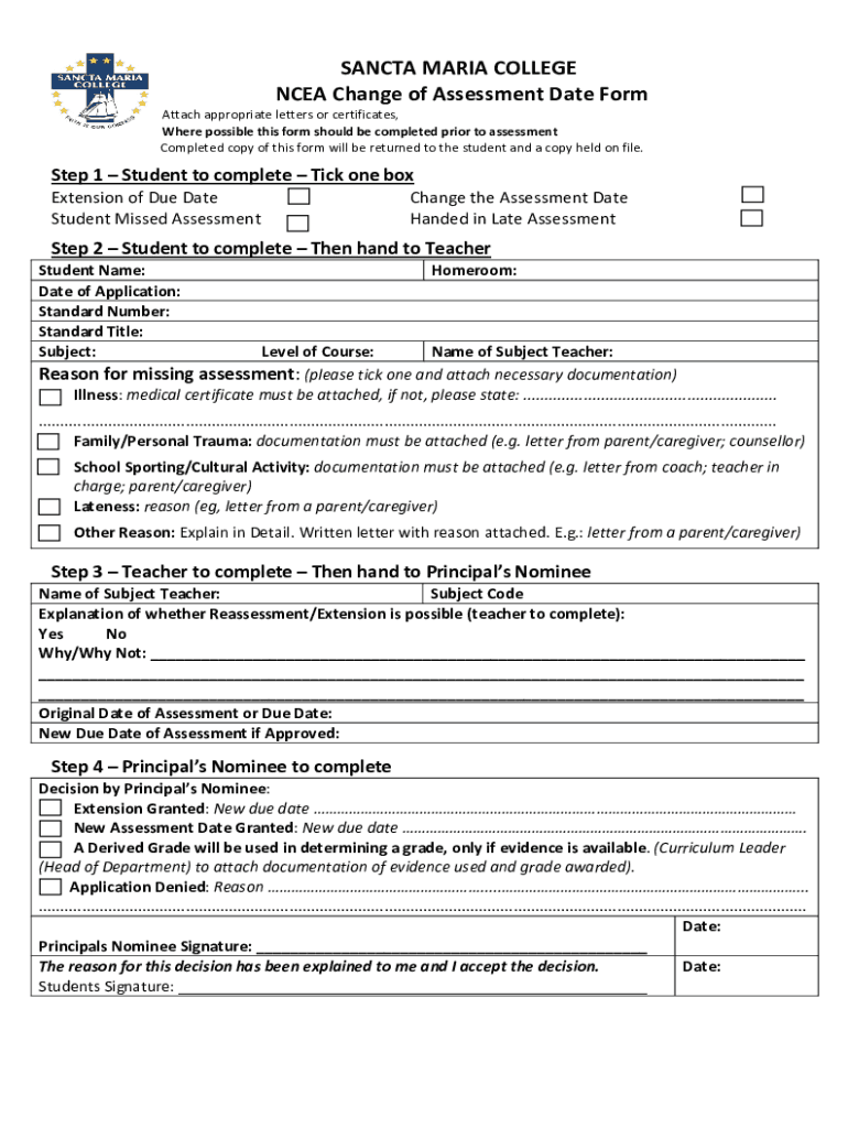 SANTA MARIA COLLEGE NCAA Change of Assessment Date Formatted appropriate letters or certificates, Where possible this form should be completed prior to assessment Completed copy of this form will