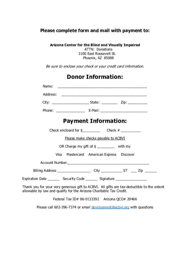 Please complete form and mail with payment to: Arizona Center for the Blind and Visually Impaired ATTN: Donations 3100 East Roosevelt St. Phoenix, AZ 85008Be sure to enclose your check or your credit