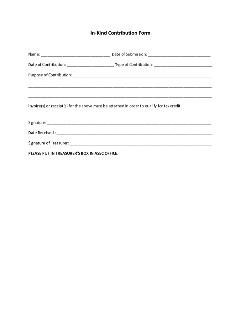 InKindContributionForm Name: DateofSubmission: DateofContribution: TypeofContribution: PurposeofContribution: Invoice(s)or receipt(s)fortheabovemustbeattachedinordertoqualifyfortaxcredit. Signature: