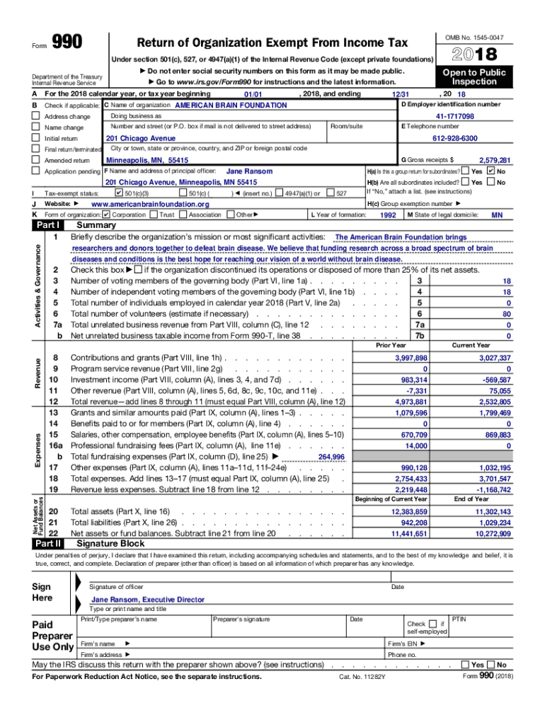 Form990OMB No. 15450047Return of Organization Exempt From Income Tax2018Under section 501(c), 527, or 4947(a)(1) of the Internal Revenue Code (except private foundations) Department of the Treasury