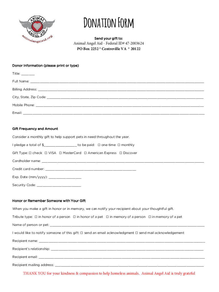 Donation Form Send your gift to:Animal Angel Aid Federal ID# 472003624 PO Box 2252 * Centreville VA * 20122Donor Information (please print or type) Title: Full Name: Billing Address: City, State,