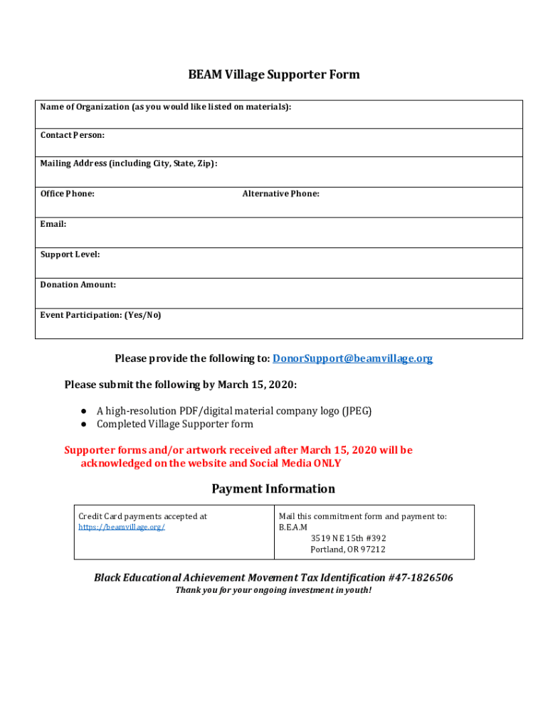 Fill out your beam village supporter form online with pdfFiller!
