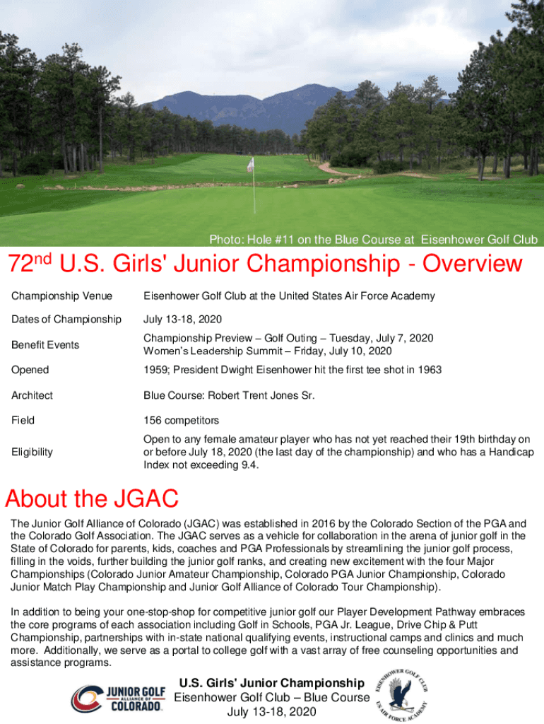 Event OverviewPhoto: Hole #11 on the Blue Course at Eisenhower Golf Club72nd U.S. Girls Junior Championship Overview Championship Venue Eisenhower Golf Club at the United States Air Force AcademyDates