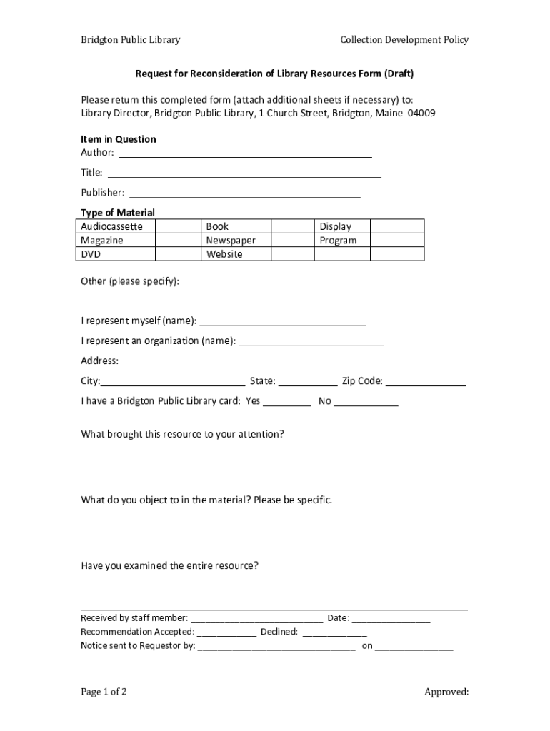 Brighton Public LibraryCollection Development PolicyRequest for Reconsideration of Library Resources Form (Draft) Please return this completed form (attach additional sheets if necessary) to: Library