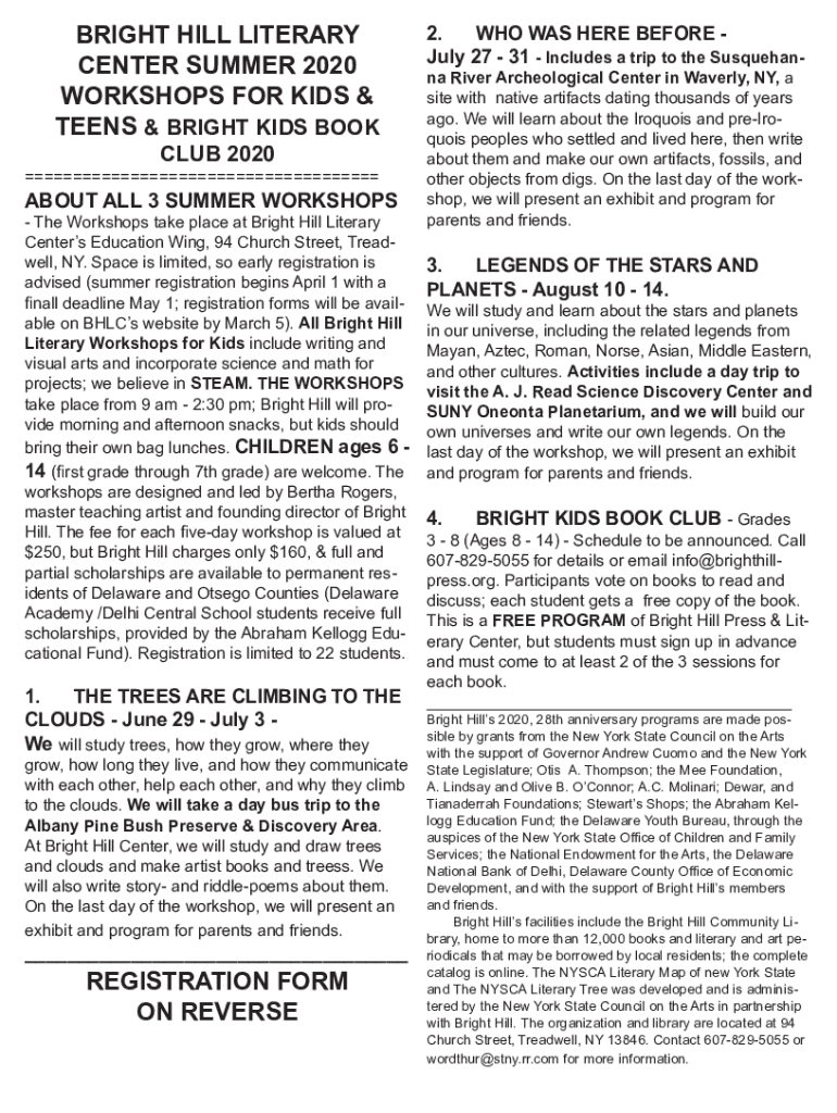 BRIGHT HILL LITERARY CENTER SUMMER 2020 WORKSHOPS FOR KIDS & TEENS & BRIGHT KIDS BOOK CLUB 2020ABOUT ALL 3 SUMMER WORKSHOPS The Workshops take place at Bright Hill Literary Centers Education Wing,