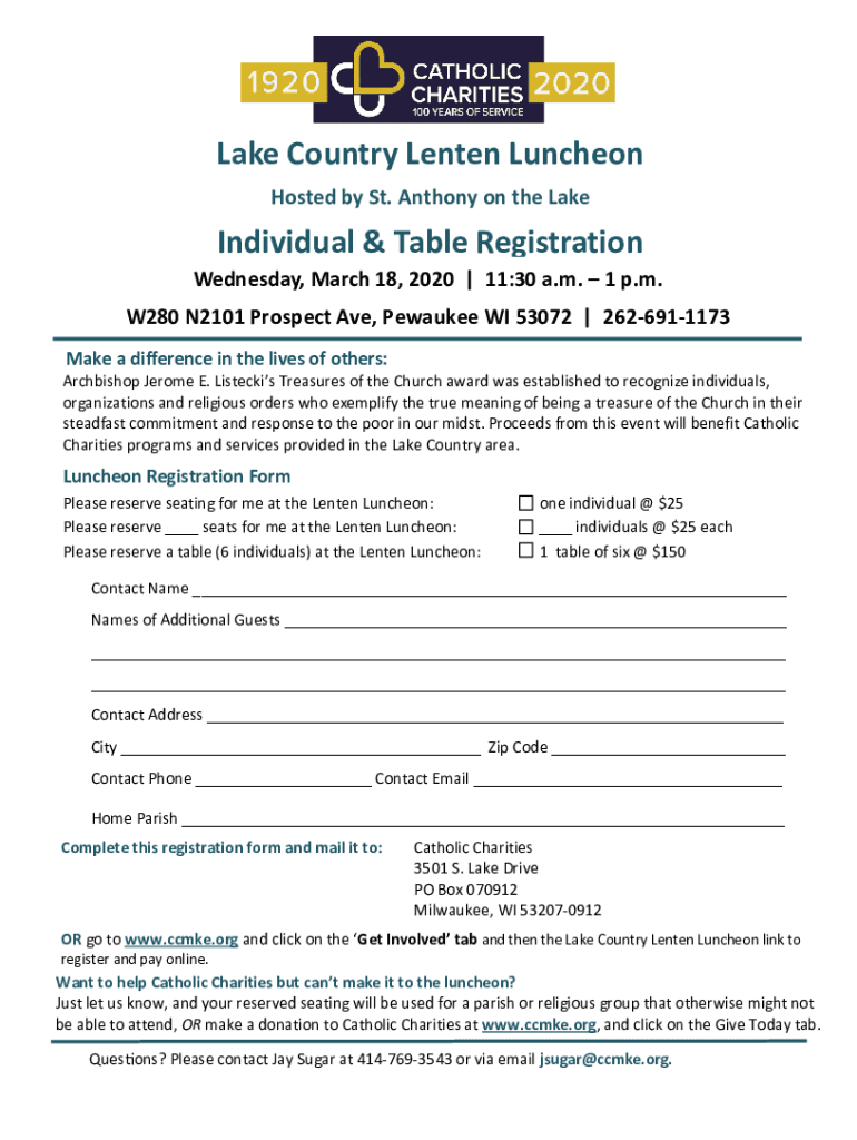 Filling out the Lake Country Lenten Luncheon typically involves completing an event registration form that collects details such as participant names, contact information, and meal preferences.