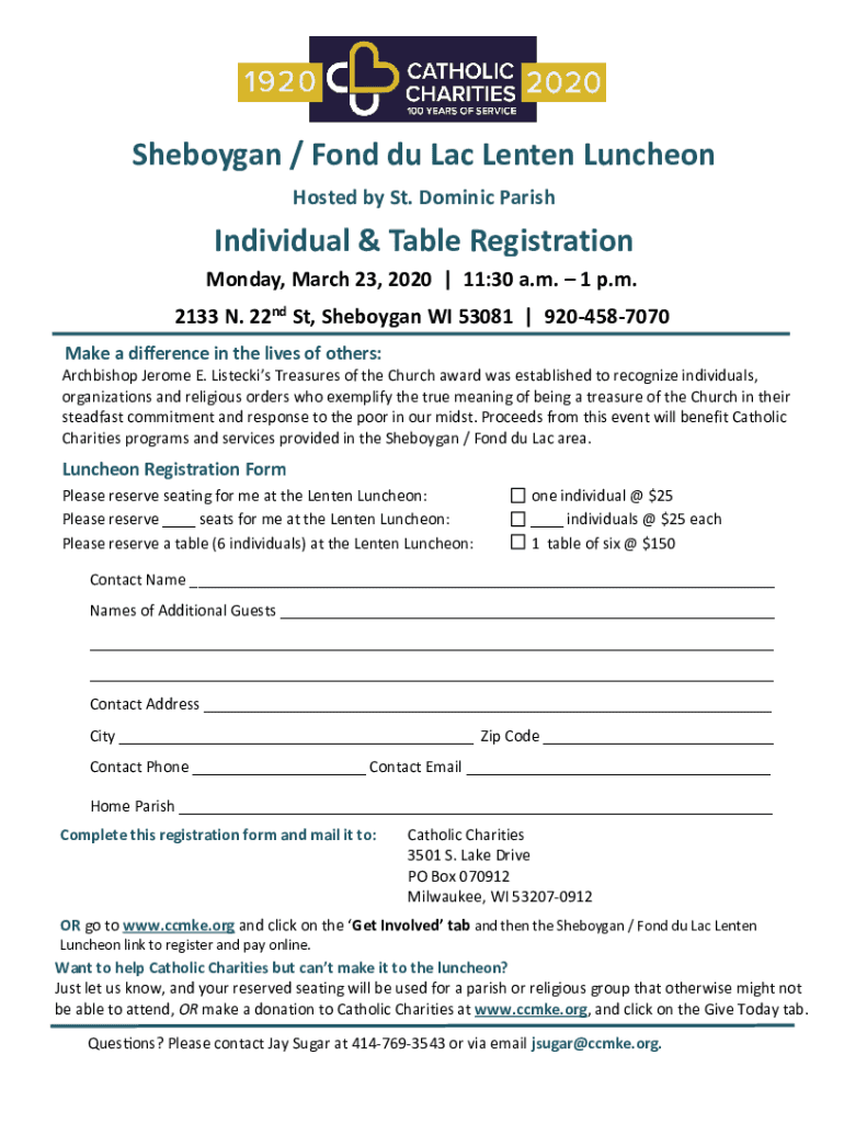 Sheboygan / Fond du Lac Lenten Luncheon Hosted by St. Dominic ParishIndividual & Table Registration Monday, March 23, 2020 11:30 a.m. 1 p.m. 2133 N. 22nd St, Sheboygan WI 53081 9204587070 Make a difference