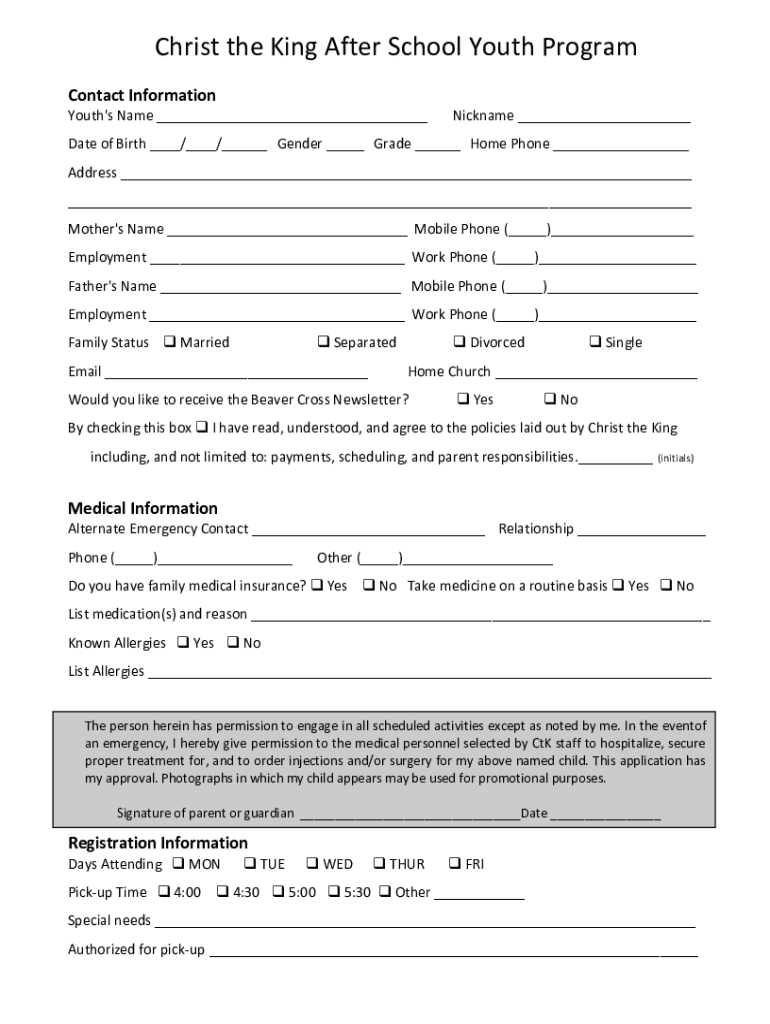 Christ the King After School Youth Program Contact Information Youth's Name Nickname Date of Birth / / Gender Grade Home Phone Address Mother's Name Mobile Phone () Employment Work Phone () Father's
