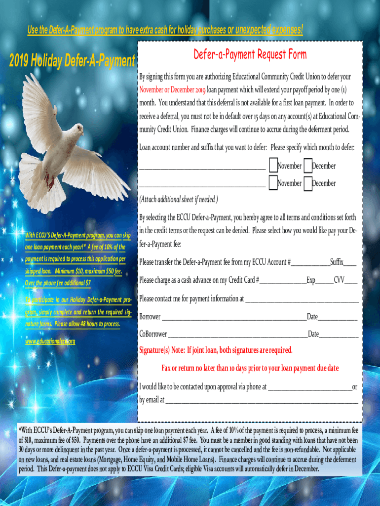 Use the DeferAPayment program to have extra cash for holiday purchases or unexpected expenses!2019 Holiday DeferAPaymentDeferaPayment Request Form