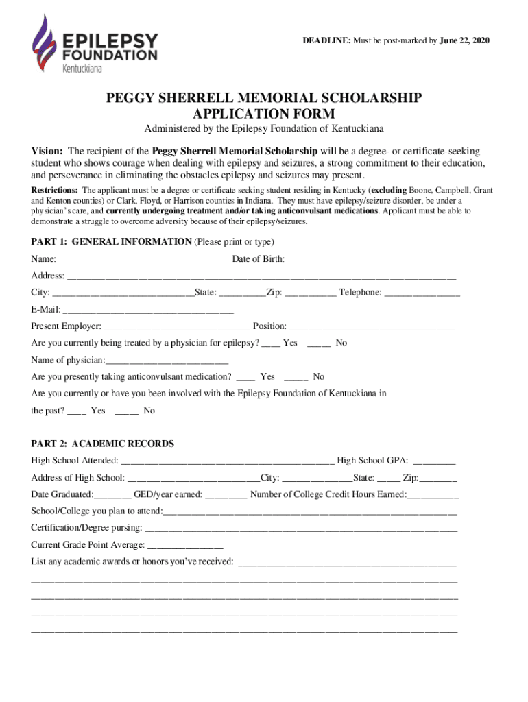 DEADLINE: Must be postmarked by June 22, 2020PEGGY SHERRILL MEMORIAL SCHOLARSHIP