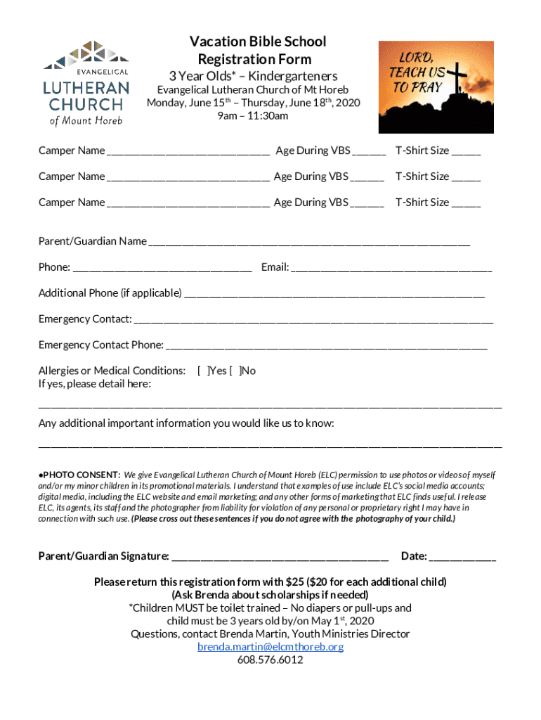 Vacation Bible School Registration Form 3-Year-Olds* KindergartenersEvangelical Lutheran Church of Mt More Monday, June 15th Thursday, June 18th, 2020 9am 11:30am Camper Name Age During VBS Shirt