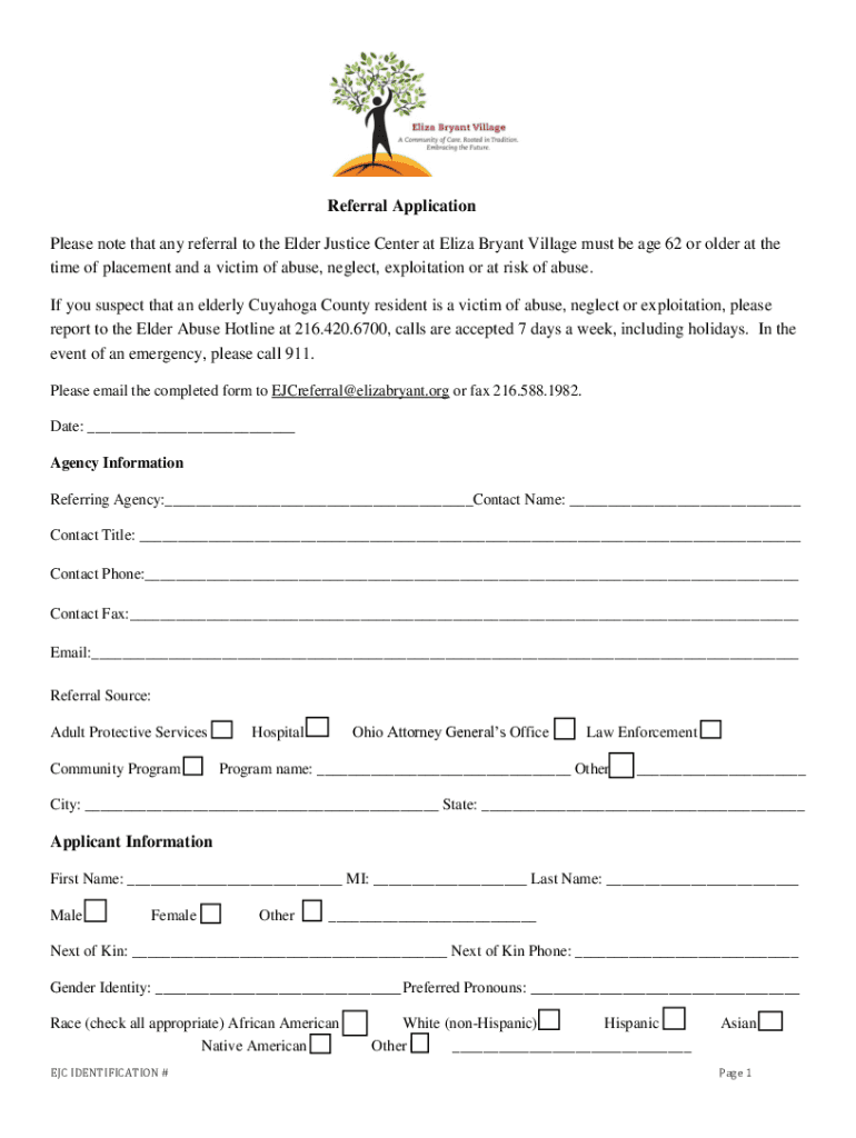 Please note that any referral to the Elder Justice Center at Eliza Bryant Village must be age 62 or older at the