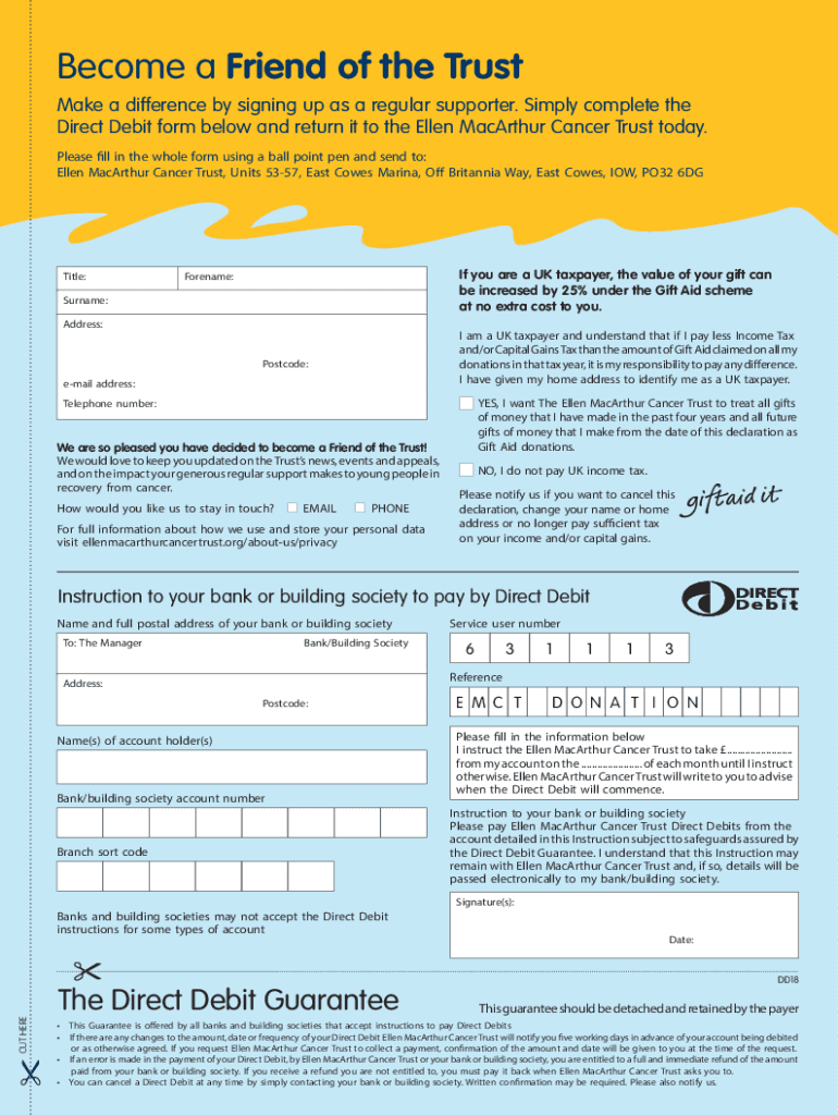 Direct Debit form below and return it to the Ellen MacArthur Cancer Trust today.