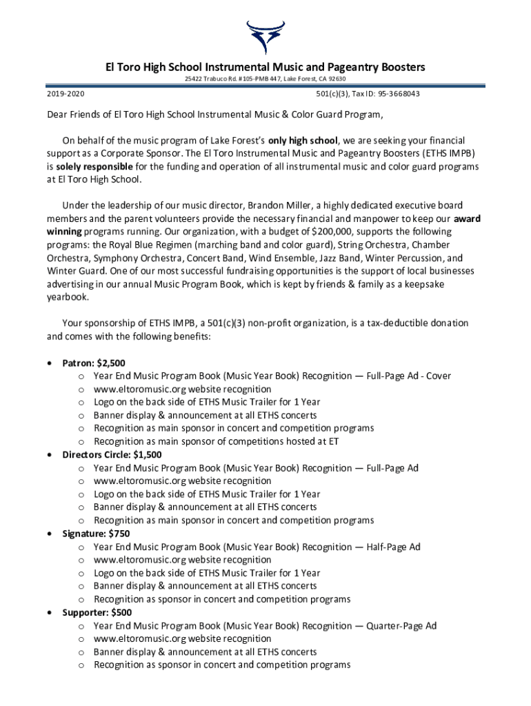 El Too High School Instrumental Music and Pageantry Boosters 25422 Traduce Rd. #105PMB 447, Lake Forest, CA 9263020192020501(c)(3), Tax ID: 953668043Dear Friends of El Too High School Instrumental