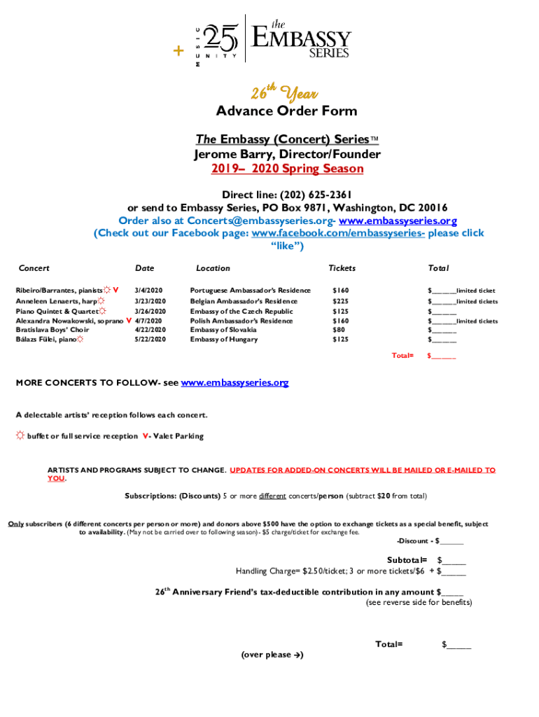 + 26th Irradiance Order Form The Embassy (Concert) Series Jerome Barry, Director/Founder 2019 2020 Spring Season Direct line: (202) 6252361 or send to Embassy Series, PO Box 9871, Washington, DC 20016