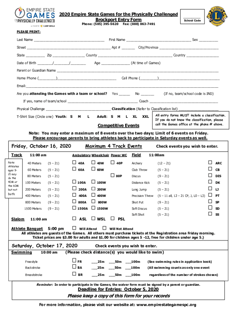 2020 Empire State Games for the Physically Challenged Brock port Entry Form Phone: (585) 3955620Fax: (888) 8637491 School Codebase PRINT:Last Name First Name Sex Street Apt # City/Province State Zip