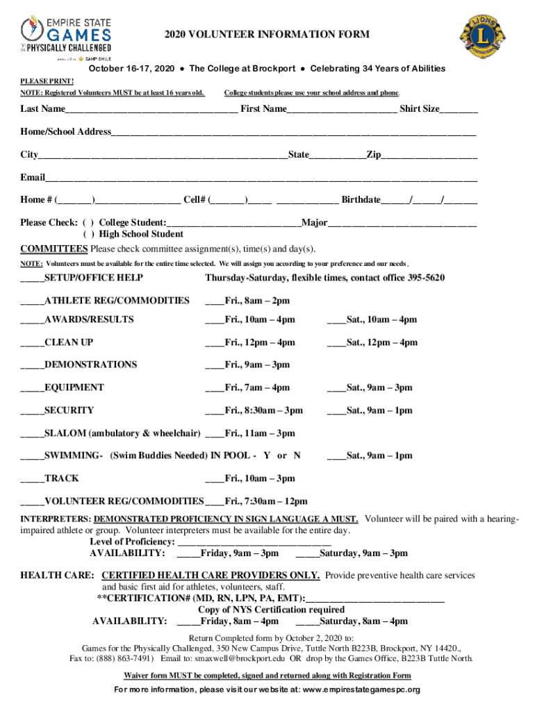 2020 VOLUNTEER INFORMATION FORM October 1617, 2020 The College at Brock port Celebrating 34 Years of Abilities PLEASE PRINT! NOTE: Registered Volunteers MUST be at least 16 years old. College students