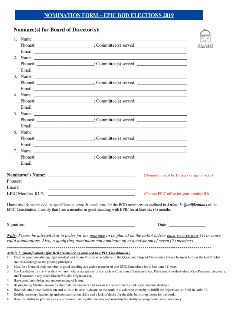 NOMINATION FORM EPIC BOD ELECTIONS 2019Nominee(s) for Board of Director(s): 1. Name: Phone#: ; Committee(s) served: Email: 2. Name: Phone#: ; Committee(s) served: Email: 3. Name: Phone#: ; Committee(s)