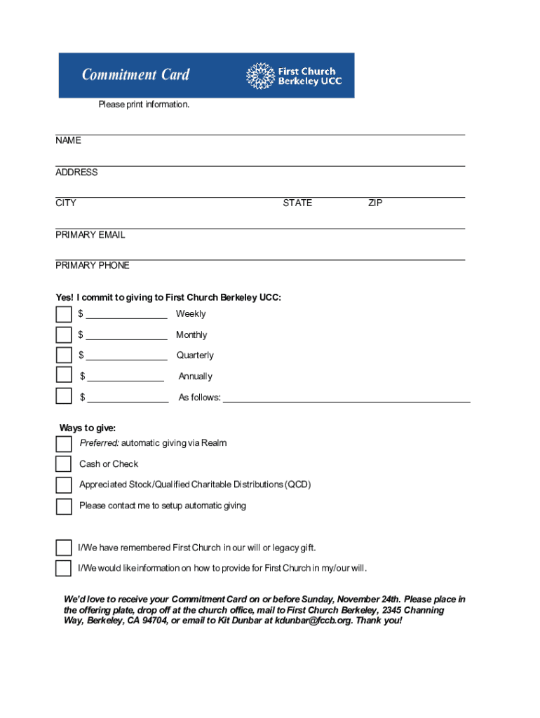 Commitment Card Commitment Please print information. NAME ADDRESS CITY STATE ZIP PRIMARY EMAIL PRIMARY PHONE Yes! I commit to giving to First Church Berkeley UCC:$$$ Weekly Monthly Quarterly Annually