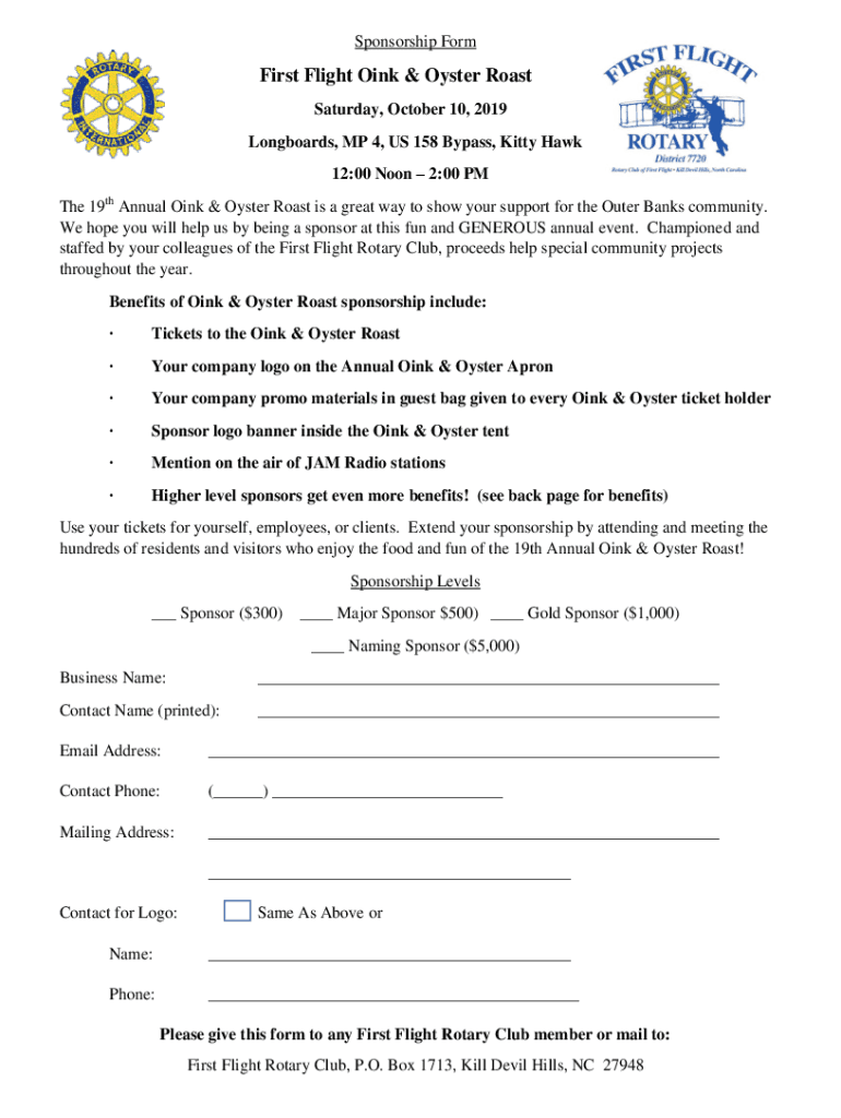 Sponsorship Formalist Flight Oink & Oyster Roast Saturday, October 10, 2019 Long boards, MP 4, US 158 Bypass, Kitty Hawk 12:00 Noon 2:00 PM The 19th Annual Oink & Oyster Roast is a great way to show
