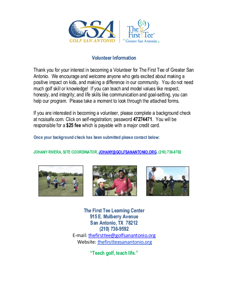 Thank you for your interest in becoming a Volunteer for The First Tee of Greater San