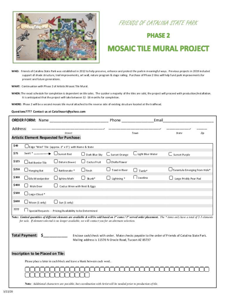 FRIENDS OF CATALINA STATE PARK WHO: Friends of Catalina State Park was established in 2012 to help preserve, enhance and protect the park in meaningful ways. Previous projects in 2019 included support