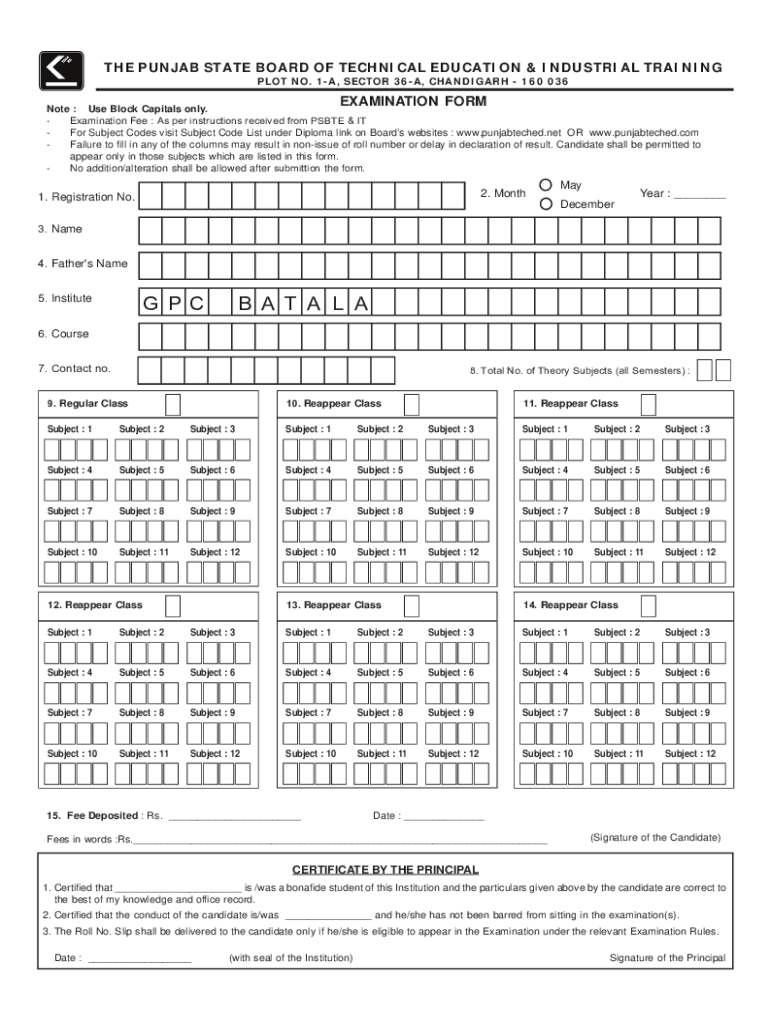 THE PUNJAB STATE BOARD OF TECHNICAL EDUCATION & INDUSTRIAL TRAINING PLOT NO. 1A, SECTOR 36A, CHANDIGARH 160 036EXAMINATION Footnote : Use Block Capitals only. Examination Fee : As per instructions