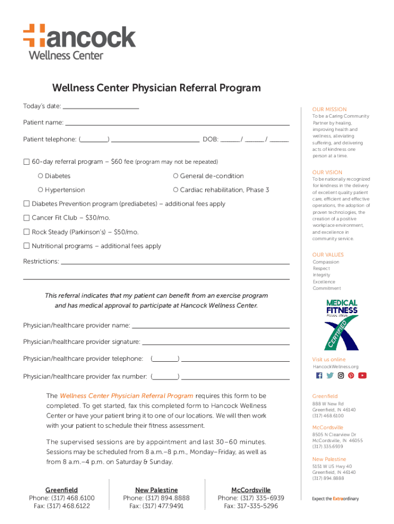 Wellness Center Physician Referral Program Today's date:OUR MISSIONPatient name:Patient telephone: ()DOB: / / 60day referral program $60 fee (program may not be repeated) Diabetes General recondition