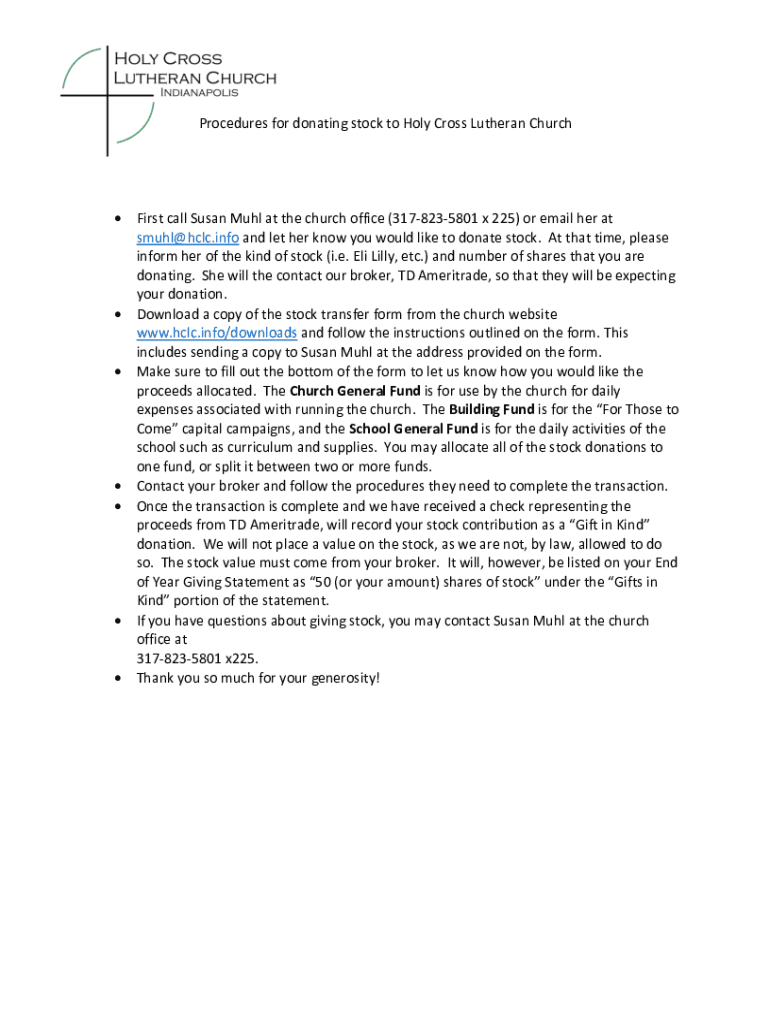 Procedures for donating stock to Holy Cross Lutheran Church First call Susan Mull at the church office (3178235801 × 225) or email her at SMUH HCC.info and let her know you would like to donate stock.
