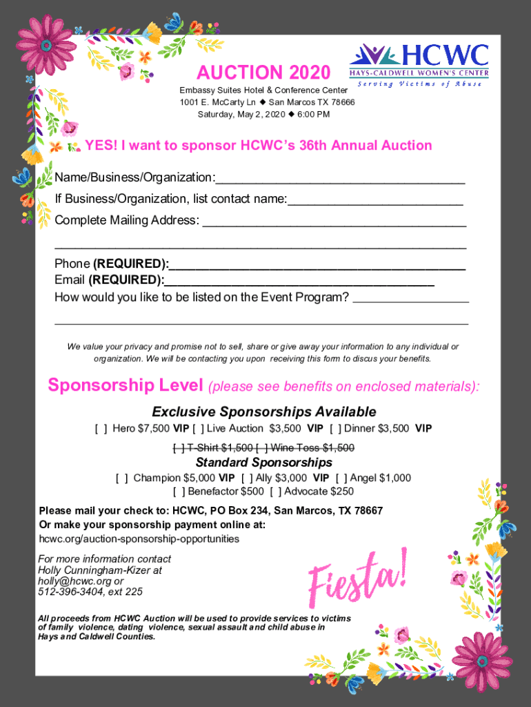 AUCTION 2020 Embassy Suites Hotel & Conference Center 1001 E. McCarty Ln San Marcos TX 78666 Saturday, May 2, 2020 6:00 YES! I want to sponsor Hawks 36th Annual Auction Name/Business/Organization: