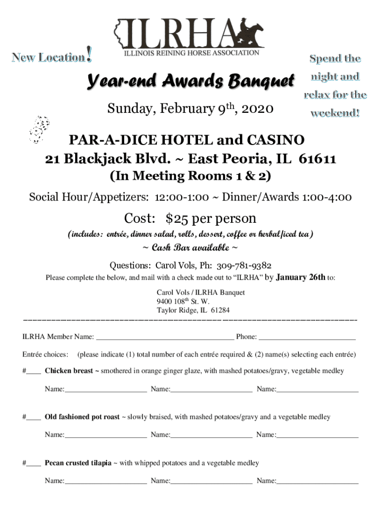 Yearend Awards Banquet Sunday, February 9th, 2020 PARADISE HOTEL and CASINO 21 Blackjack Blvd. East Peoria, IL 61611 (In Meeting Rooms 1 & 2) Social Hour/Appetizers: 12:001:00 Dinner/Awards 1:004:00Cost: