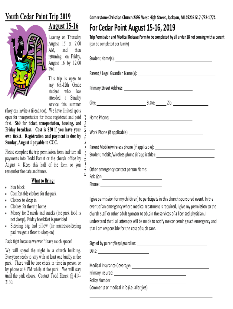 Youth Cedar Point Trip 2019 August 1516Please complete the trip permission form and turn all payments into Todd Ernst or the church office by August 4. Keep this half of the form, so you remember