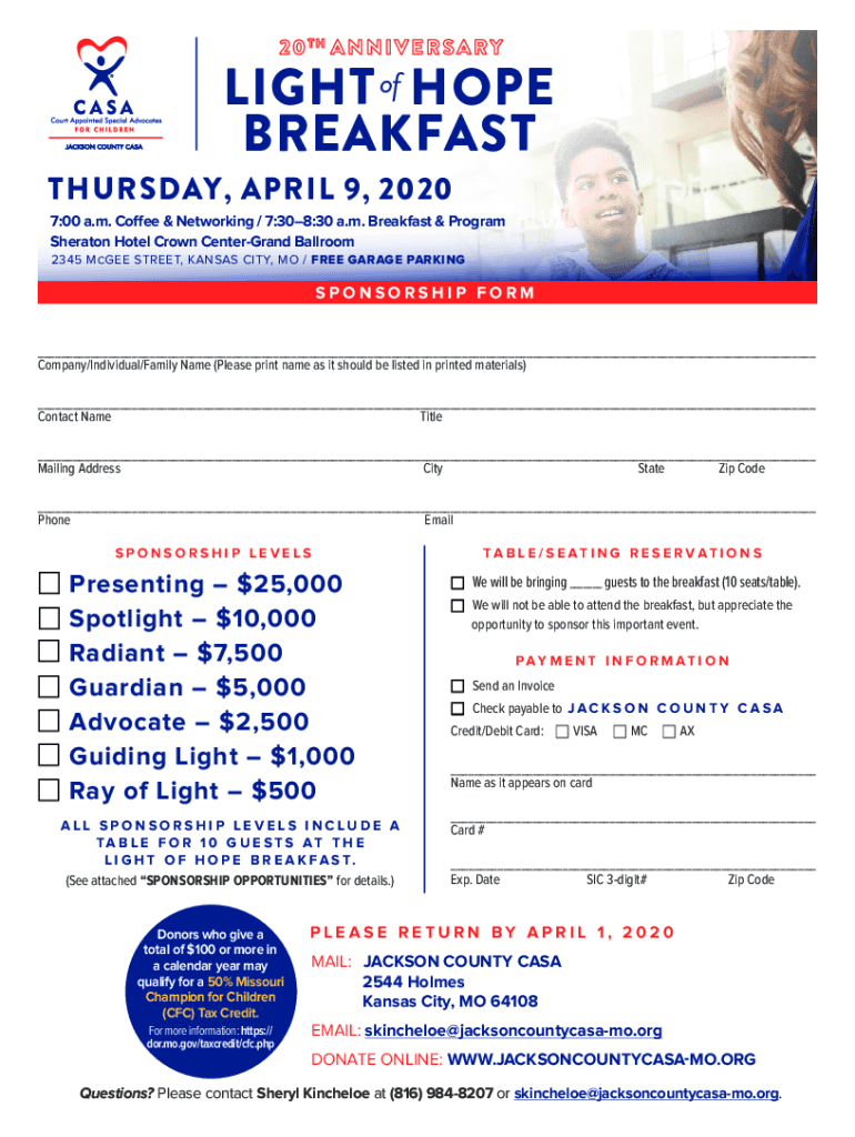 LIGHT of HOPE BREAKFAST Thursday, April 9, 20207:00 a.m. Coffee & Networking / 7:308:30 a.m. Breakfast & Program Sheraton Hotel Crown Centerboard Ballroom 2345 McGee Street, Kansas City, MO / Free