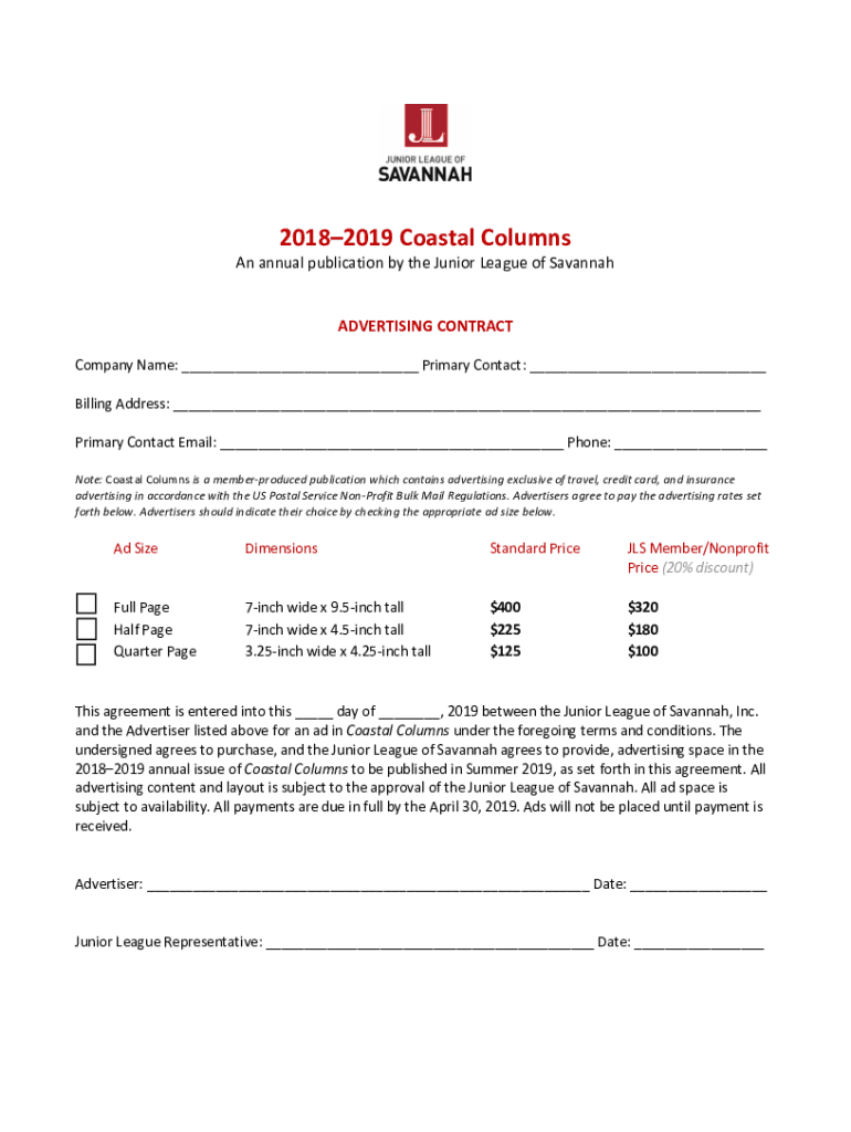 PO Box 13268, Savannah, GA 3141620182019 Coastal Columns Advertising Information Thank you for your interest in the Junior League of Savannah's Coastal Columns annual magazine. Please review the following