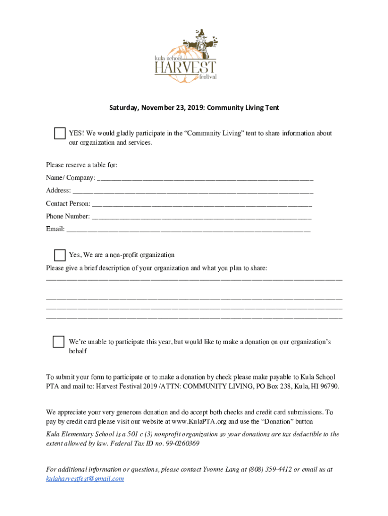 Saturday, November 23, 2019: Community Living Tent YES! We would gladly participate in the Community Living tent to share information about our organization and services. Please reserve a table for: