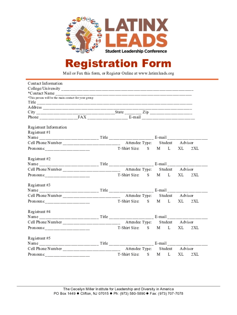Registration Formal or Fax this form, or Register Online at www.latinxleads.org Contact Information College/University *Contact Name *This person will be the main contact for your groupie Address
