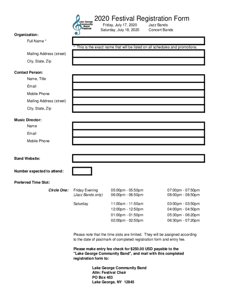 2020 Festival Registration Form Friday, July 17, 2020, Saturday, July 18, 2020Jazz Bands Concert BandsOrganization: Full Name * * This is the exact name that will be listed on all schedules and promotions.