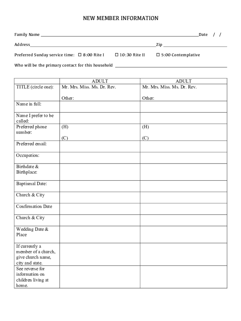 NEW MEMBER INFORMATION Family NameDateAddressZipPreferred Sunday service time: o 8:00 Rite Io 10:30 Rite Rio 5:00 Contemplative will be the primary contact for this householdTITLE (circle one):ADULT